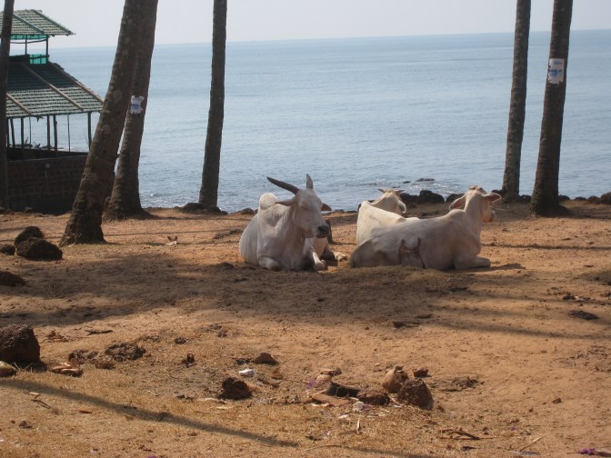 Spent the afternoon on Anjuna beach swimming and sunbathing and hanging out with the beach cows. There’s a big flea-market here on Wednesdays, so I’ll stay for that then think about where to go next. The room I have is clean and has its own clean private toilet for very little money, so I may make this my base for the next week and take day trips.
