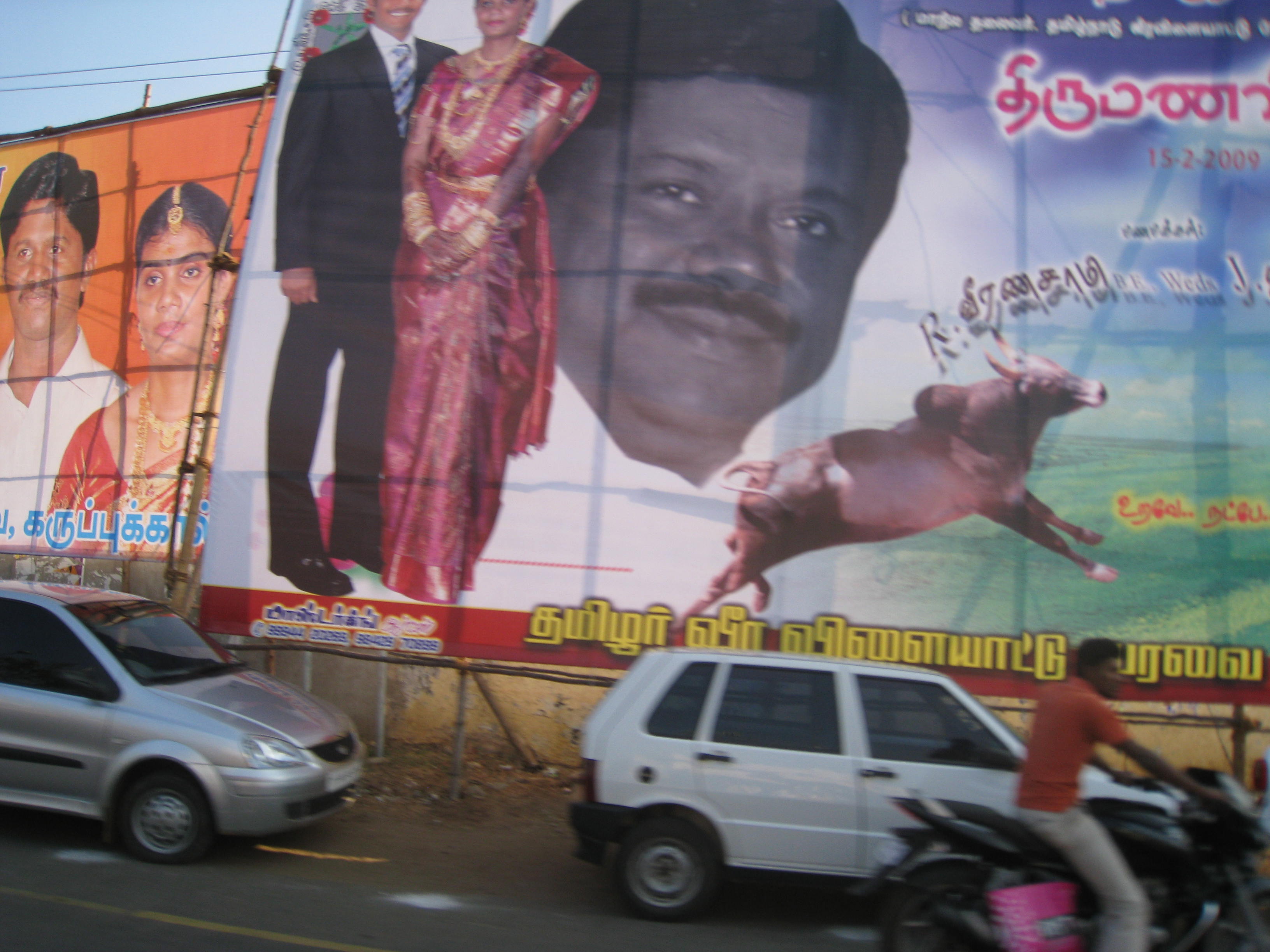 I took the bus from Trichy to Madurai in the afternoon, about three hours through the flat, fertile Cauvery River delta. Approaching Madurai the landscape suddenly became dramatic, with volcanic outcroppings and huge piles of granite boulders. Twenty kilometers outside of Madurai billboard-size posters appeared, advertizing the ‘King of Granite’s daughter’s wedding’. They featured the beaming bride and groom (at about three times life size) and heads of other (presumably) family members, including the Granite King himself. In the rickshaw from the out-of-town bus station into the center I asked the driver about it, and he said that Sunday (today) was a very auspicious day for weddings. He said that five crore guests ( 50 million) were invited to the Granite King’s celebration, and that the city buses would be free that day and there would be free food passed out. I’m not sure I exactly believed him… And I couldn’t understand everything he said – free food for how many people, etc. but it was clear that the Granite King was spending a whopping amount of money. We passed by the hall where the wedding was to take place; it was lit up with thousands of colored lights.