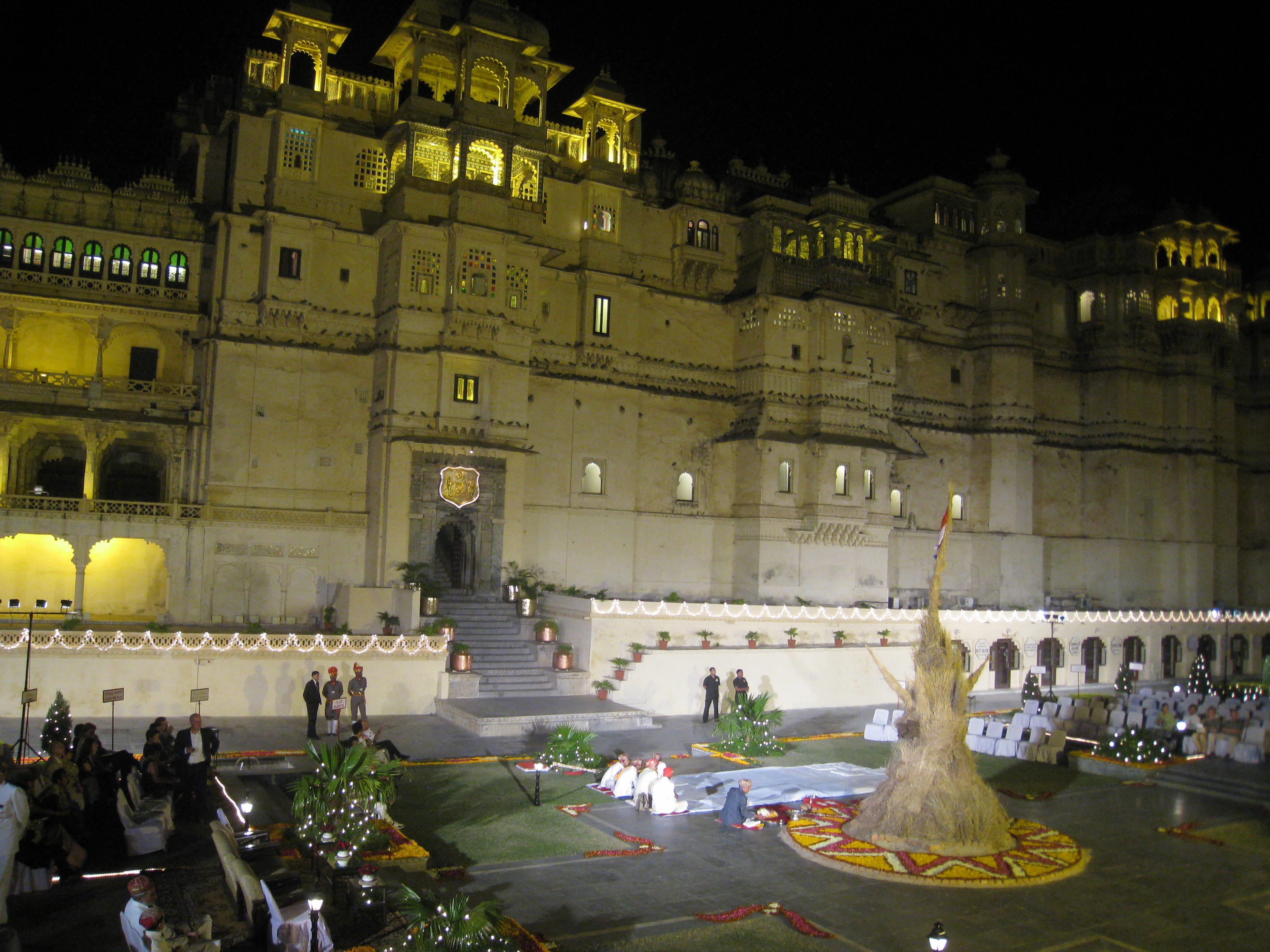 Last night I treated myself to a Holi celebration with the Maharaja of Udaipur. For 80 bucks (majorly blowing my budget but worth every penny) I dressed up in my fancy sari and strolled back up to the palace, bypassing the plebs partying in the streets. Formally uniformed guards took tickets and directed guests to the largest courtyard where seats were set up around a central stage with a huge haystack surrounded by patterns made of flowers. Fountains splashed, candles flickered, multiple bands played at once (different songs) just in case you couldn’t hear one of them. The royal family arrived in horse-drawn carriages, dressed in jeweled apparel. Saddhus gave blessings, then eventually the bonfire was lit and the royal family processed around it three times. At various occasions we were treated to Scottish tunes performed by a band wearing red and black tartan and tam-o-shanters on bagpipes that didn’t sound quite Scottish. Mom, never fear, I took video.