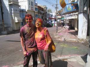 At eight this morning my slightly aching head was rousted out of bed by Bollywood music at volume on the street below. The city is on holiday today and it’s impossible not to be infected its energy. Bands of youths and the not-so-youthful are running around in the streets with bags of brightly-colored powder smearing it all over each other. It took me until one o’clock to go outside and yet my face was already pink and green courtesy of the hotel owner. From the rooftop restaurant I listened to the shouting and singing and watched powder wars. Daniel arrived for lunch almost unrecognizable, which made me itch to get out on the street. Once out there it was mayhem; it took only minutes to be covered in every color imaginable. Boys (and they were all male, most Indian women prudently staying inside most of the day) would run up to you with powder and smear it all over your body, then hug you twice, wishing you a happy Holi. It was good fun while I had a male companion, but Daniel wasn’t feeling well and went back to his hotel to rest. I thought I would walk to some gardens on the other side of the city, but within five minutes of being alone I gave up. Gangs of young men rushed me and groped hard; I gave almost as good as I got, planting my foot into the backside of one offender and pushing another into a wall, but it lost its charm quickly.