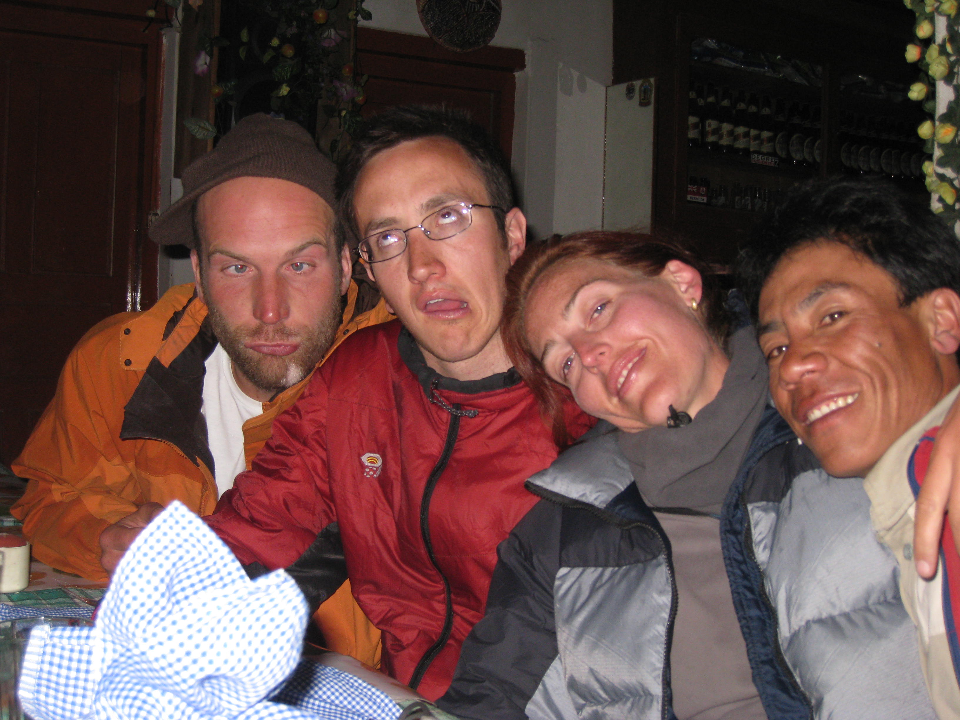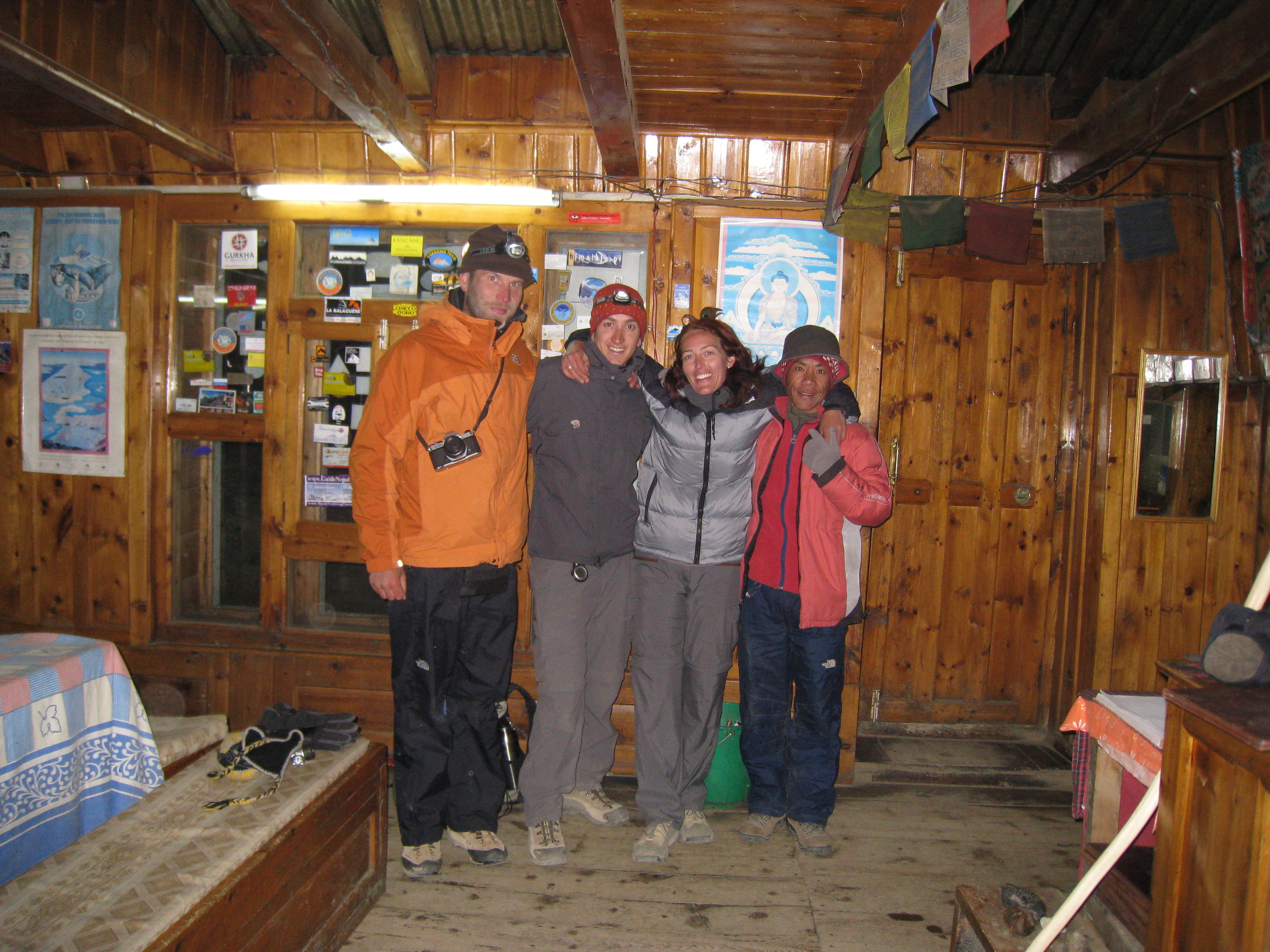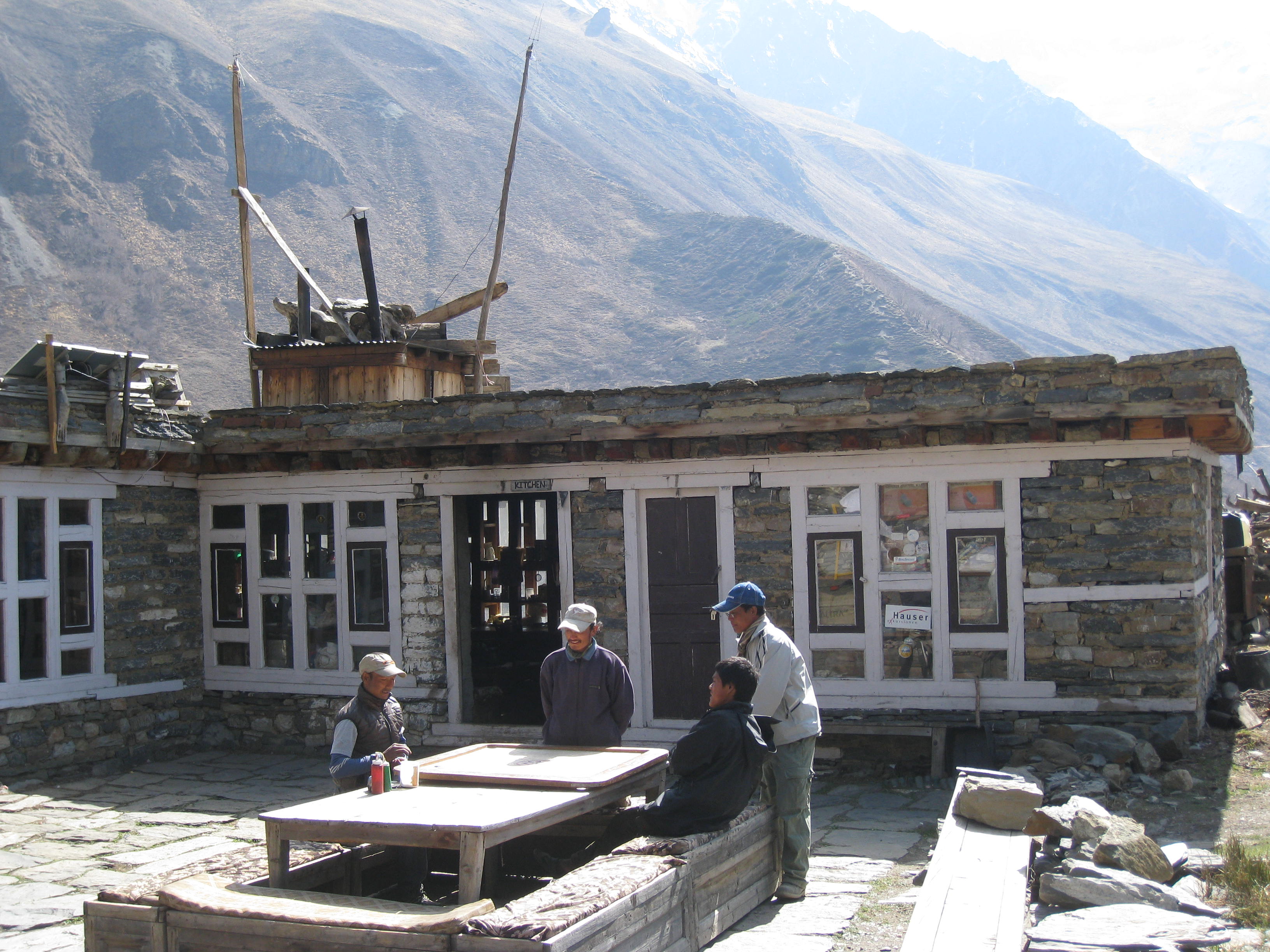 We reached the pass at 8:45. It was crazy cold at 5400 meters, but I felt thrilled to be there. There was a man in a little hut serving tea; I bought a handful of snickers bars which ended up coming in handy when lunch did not appear for five more hours. Continuing the feeling from the previous few nights there was a very fraternal feeling among the trekkers at the top. We all took the same obligatory photo with the sign saying it was the highest trekking pass in the world.