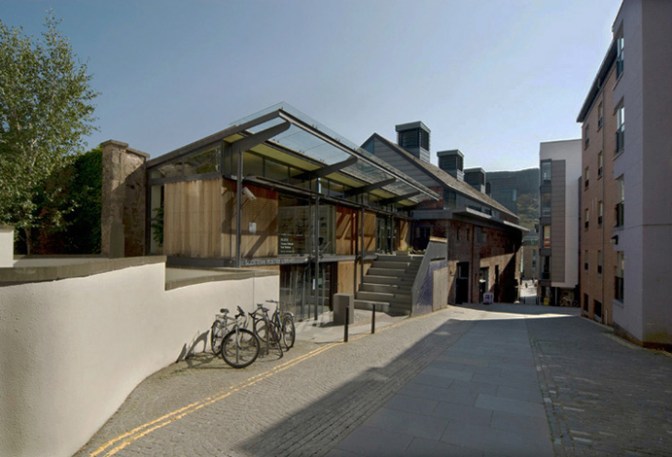 One of my favourite buildings in Edinburgh is the Scottish Poetry Library by Malcolm Fraser Architects. It’s tucked away down a narrow close (alleyway) off the Royal Mile, and it’s a small building but packs a big dose of quirky charm. I love how neatly it fits into its context, how clever the use of materials is, and how underwhelming it is. It presents itself – and by extension poetry – as an old, comfortable friend who has interesting taste.