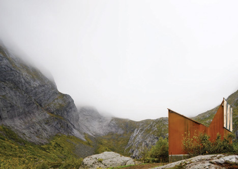 In Scotland most public toilets seem to be intentionally designed as manky boxes for underage drinking and snogging. Wish we had some like this roadside stop in Norway by Manthey Kula Architects.