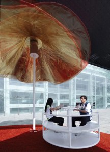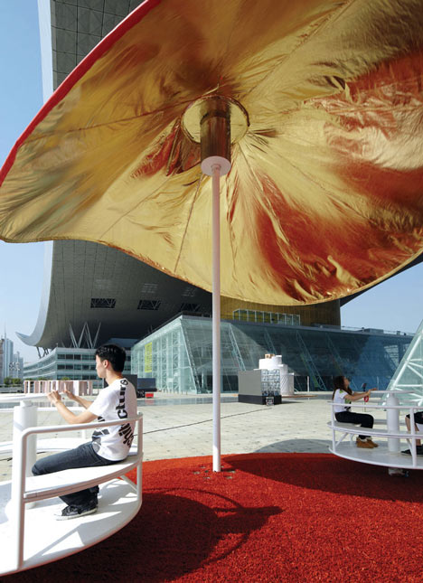I love anything get inspires people to get involved with their environment. Check out this installation in Shenzen for the Biennale of Architecture and Urbanism by Clavel Arquitectos. By twirling yourself around in the carousels, you provide the energy for the parasols to swirl and light up. What’s funny is that Dezeen specifically says ‘children’ are supposed to do it, but when you watch the videos, it’s mostly adults playing on them. And why not? ( I also love the golden undersides of the parasols… ooh, shiny..)