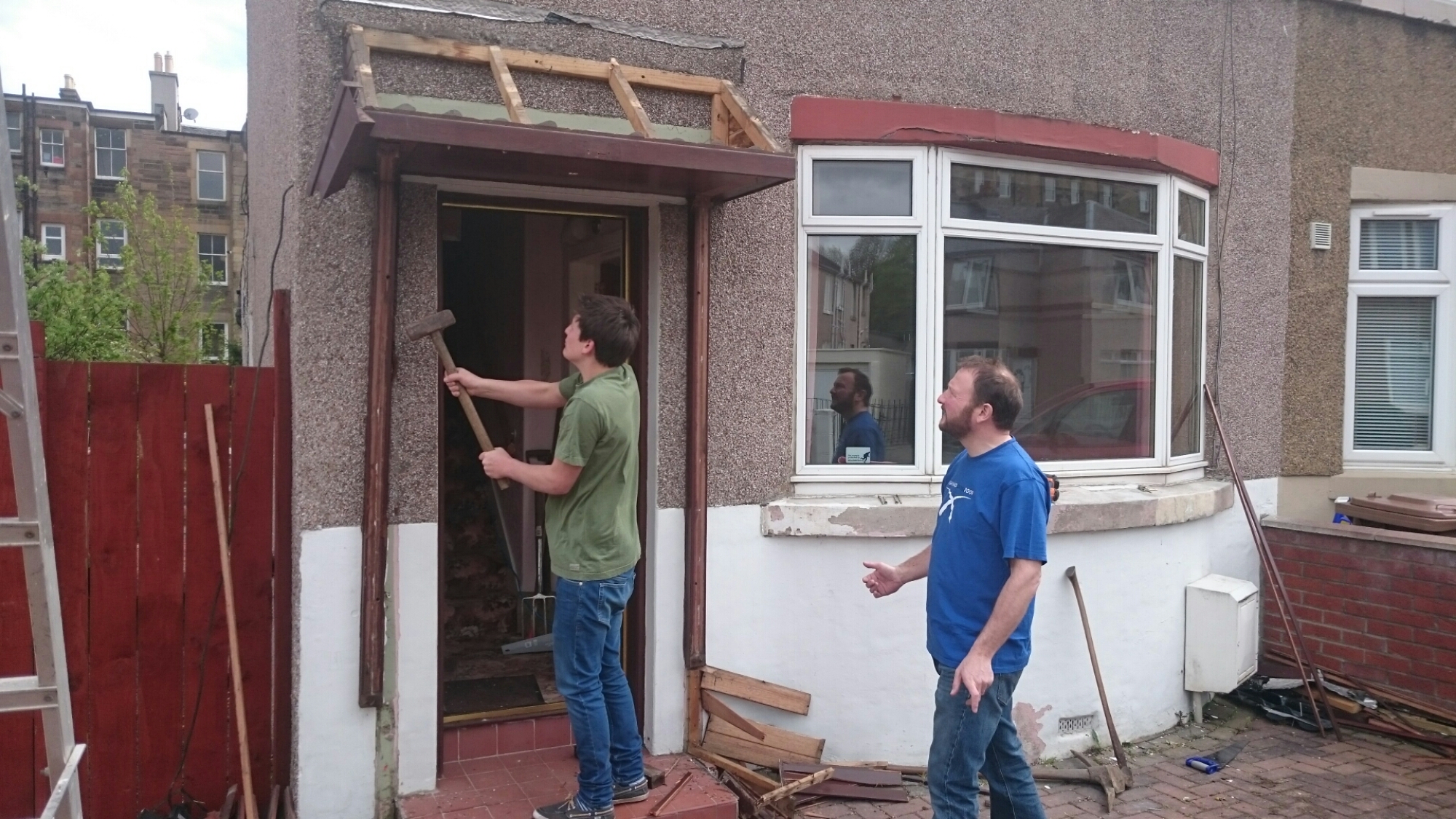 This afternoon I got my special demolition crew onto the ugly little front porch.